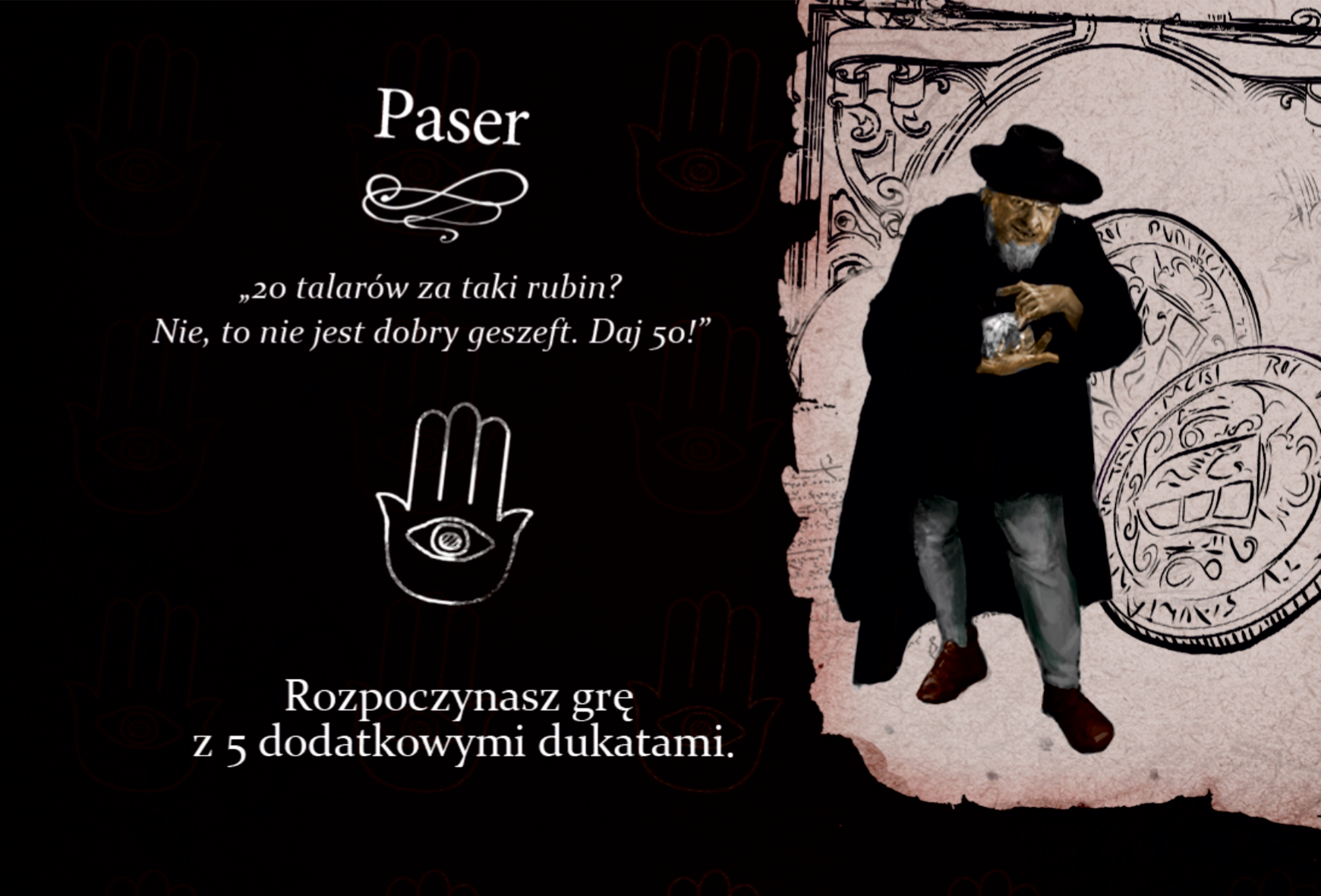 PASER – Żyd Jakub, złotnik z Kazimierza, gdzie zaczynał w skromnym warsztacie przy ulicy Kupa. Dzięki skupowaniu za grosze cennych złotych i srebrnych przedmiotów od rabusiów, także chrześcijańskich, przetapianiu ich, zmianie oprawy do cennych klejnotów i sprzedawanie ich z ogromnym zyskiem (przekupując krakowskiego podwojewodziego, by patrzył przez palce na jego sprawki), doszedł do wielkiego majątku. Należy do starszyzny żydowskiej, decyduje o życiu całej gminy i panuje nad całym przestępczym podziemiem kazimierskim. Powoli wysuwa macki po Stradom, ale myśli także o opanowaniu Krakowa, gdzie zdobył już ważny przyczółek – kram w Kramach Bogatych. Na razie musi na noc wracać do Kazimierza, ale zamierza rychło to zmienić – połowa patrycjuszy i szlachty mającej posesje w mieście siedzi u niego w kieszeni i tańczy, jak im zagra. Stroni od przemocy, ale gdy jest konieczna – nie waha się. Oczywiście nie nosi hańbiących żółtych naszywek na ubraniu, bo w Krakowie i w Polsce ten przepis jest martwy, przeciwnie – nosi się godnie, prawie po szlachecku.